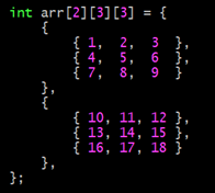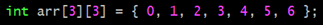 다음과 같이 1차원 배열 초기화 형태로 초기화가 이루어질 수 있다. 왜냐하면 2차원 배열은 사실 1차원 배열 구조로 메모리 상에 적재되기 때문이다. 중요한 것은 초기화될 때 명시된 초기화 값들은 메모리 상의 인덱스 순서대로 값이 대입된다.