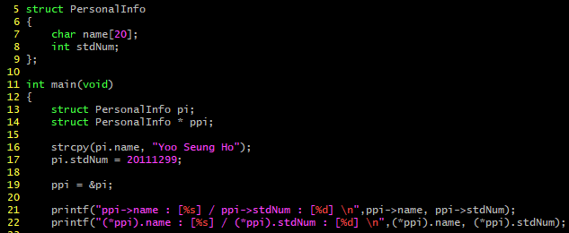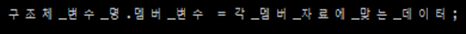 위의 예에서는 16번 라인과 17번 라인을 통해 멤버 변수에 접근하고, 대입 및 다른 곳으로의 참조를 시키는 등의 작업이 이루어진다. 중요한 것은 구조체_변수_이름 . 구조체의 멤버 변수 형식을 갖추어 직접 접근한다는 것.