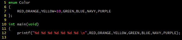 Color 자료형으로 선언되는 모든 변수들은 enum Color 정의에서 정의해 둔 상수들을 값으로 갖을 수 있다. 또한 정의된 상수들은 어디서든 지역 범위를 고려하여 사용할 수 있다. enum 정의 및 변수 선언은 구조체, 공용체와 완전히 똑같다. 그리고 상수 정의 시, 어떤 값도 넣지 않으면 순서대로 0 값부터 값이 1씩 올라가는 형태로 값의 배정이 이루어진다.