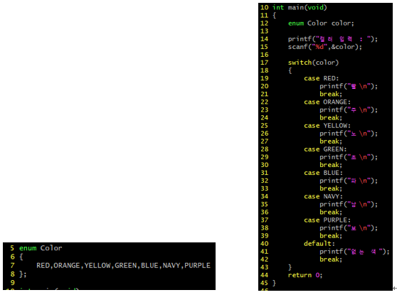 구조체나 공용체는 자료형을 명시함으로써 멤버에 저장할 값의 유형(type)을 결정하였다면, 열거형의 경우는 저장이 가능한 값 자체를 정수의 형태로 결정한다.