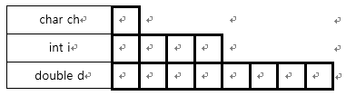 위의 그림은 구조체와 공용체의 멤버 변수들의 할당 구성을 나타낸 것이다. 굵은 검정 칸이 실제로 할당된 메모리 공간이 된다. 구조체 할당 구성에서는 각 멤버 변수 별로 크기만큼 할당이 되어 있는 것을 볼 수 있는데 공용체 할당 구성에서는 가장 큰 double 자료형의 크기만큼만 공간을 할당하고 모든 멤버 변수가 이 공간을 공유하는 형태로 할당 구성이 이루어진다.