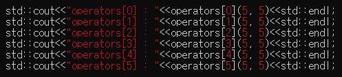 std::cout<<"operators[5] : "<<operators[5](5, 5)<<std::endl;