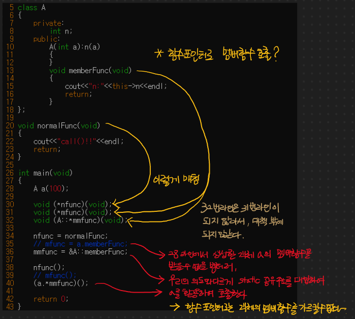 위는 함수 포인터로 객체의 멤버함수를 가리킬려고 온갖 발악을 하지만.. 되지 않는 광경을 보고 있다. 35번 줄은 말도 안되기 때문에 에러부터 난다.